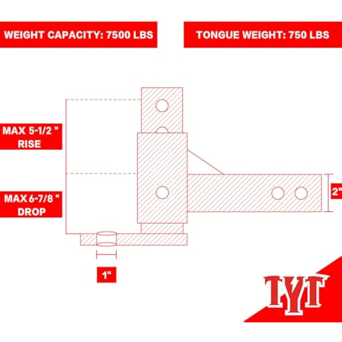 TYT Adjustable Trailer Hitch Ball Mount with 2 Hitch Pins, 1-Inch Hole, Fits 2-Inch Receiver, 5-1/2" Rise & 6-7/8" Drop Tow Hitch, 4-Position Adjustable Hitch, 7500 lbs