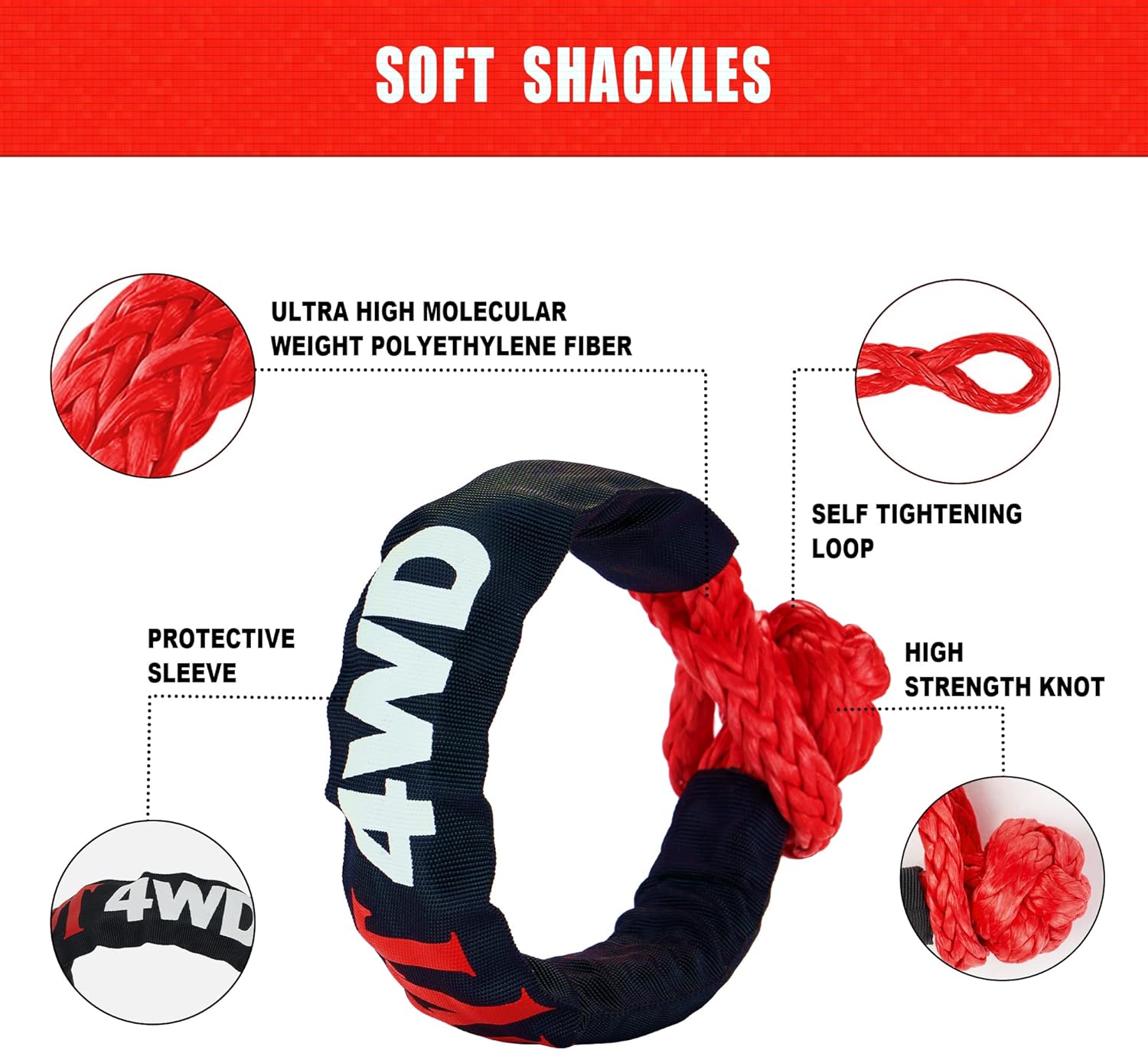 TYT Kinetic Recovery Rope,(1in x 30ft Red) 48000lbs Snatch Strap, Heavy Duty Stretch Nylon Towing Ropes with 2pcs Soft Shackles for Offroad Vehicle, Jeep, SUV, ATV, UTV, Tractor Elastic Ropes Kit